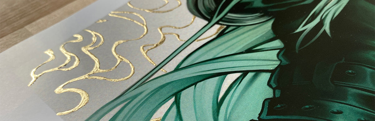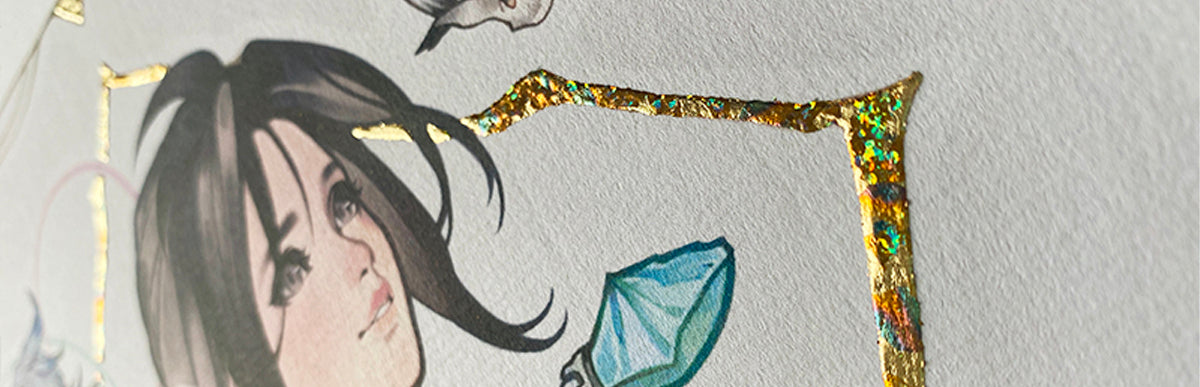 Precious pieces, embellished by my hand. Each print is unique, enhanced with flakes of gold, copper, silver, or holographic metal that I meticulously apply with patience and love.